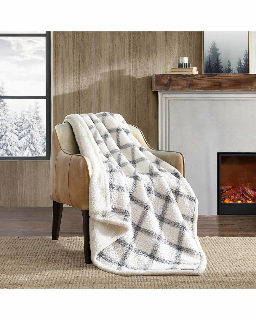 - Design details: cozy and warm, lightweight, features self-hem detailing and iconic eddie bauer logo patch, made thoughtfully using non-toxic dyes – oeko-tex certified, iconic yet minimal oversized dark charcoal plaid print on ivory ground; reverses to solid ivory faux shearling