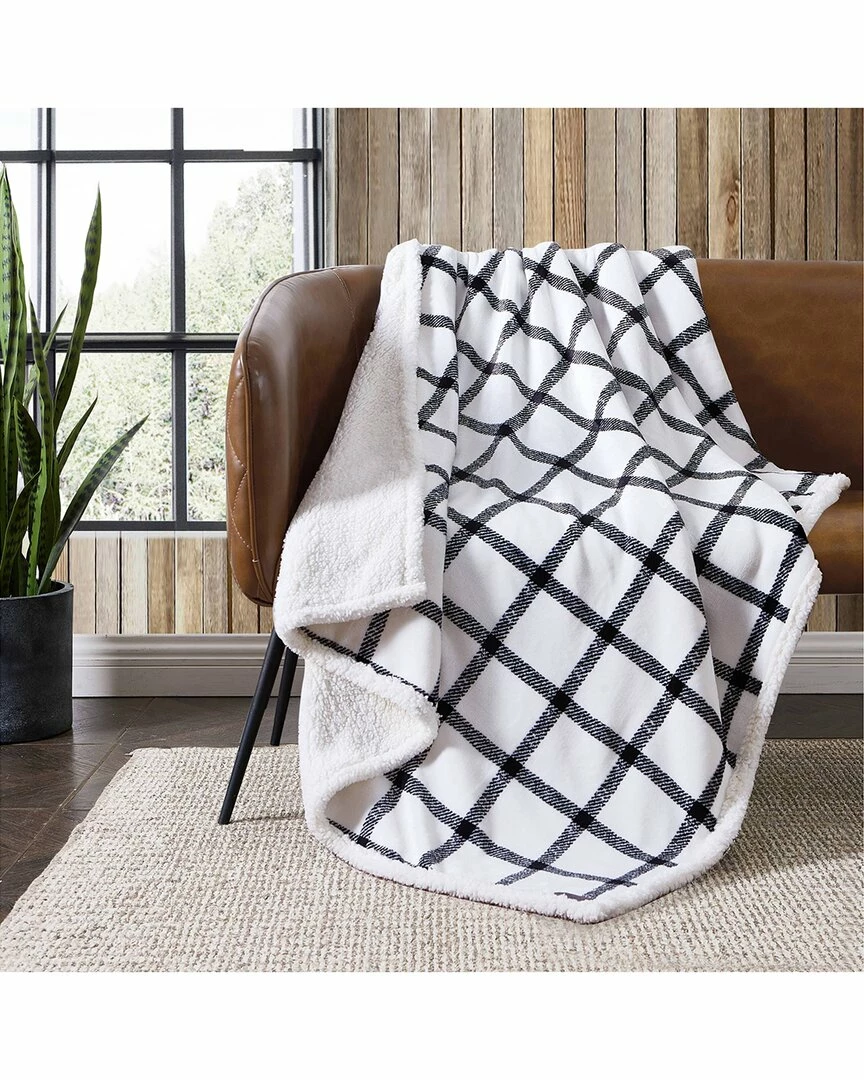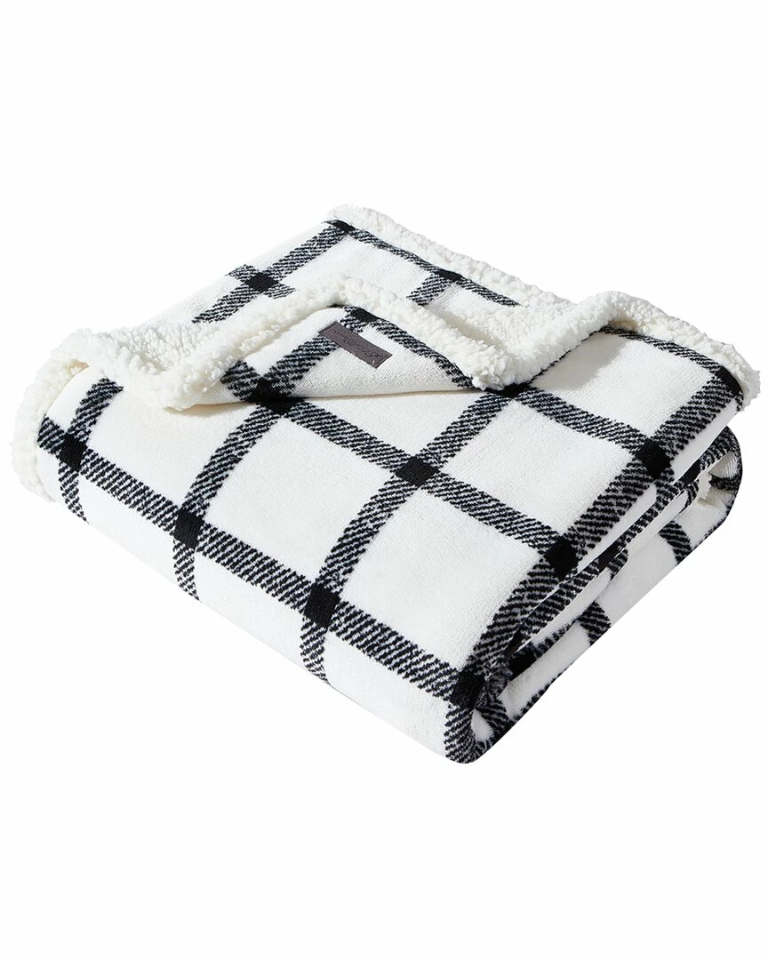 - Design details: super soft and cozy; lightweight and easily packable; faux shearling reverse for added warmth,faux shearling trim and signature eddie bauer logo label complete the look,50″x60″, eddie’s signature bunkhouse plaid in charcoal on white ground; reverses to ivory faux shearling popcorn fleece