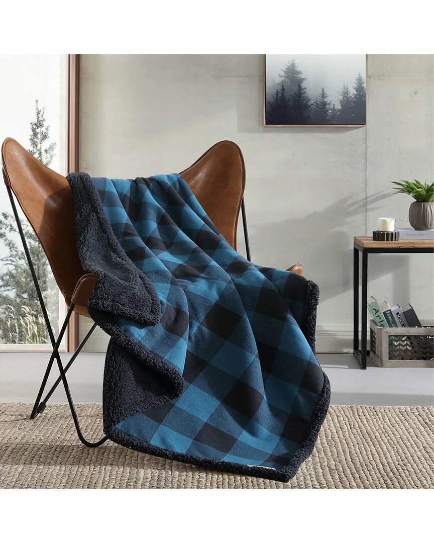 - Design details: super soft and cozy; lightweight, easily packable, and ideal for travel, signature faux shearling trim; features signature eddie bauer logo patch, standard 100 by oeko-tex certified, eddie bauer’s most signature check now available in a fresh dusted indigo and black, reverses to a black faux shearling