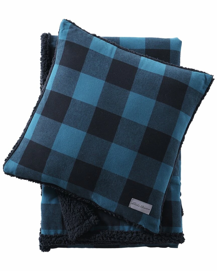 - Design details: super soft and cozy, reversible for alternate styling; features iconic eddie bauer logo patch, standard 100 by oeko-tex certified, eddie bauer signature buffalo check in blue and black; reverses to off-white popcorn sherpa