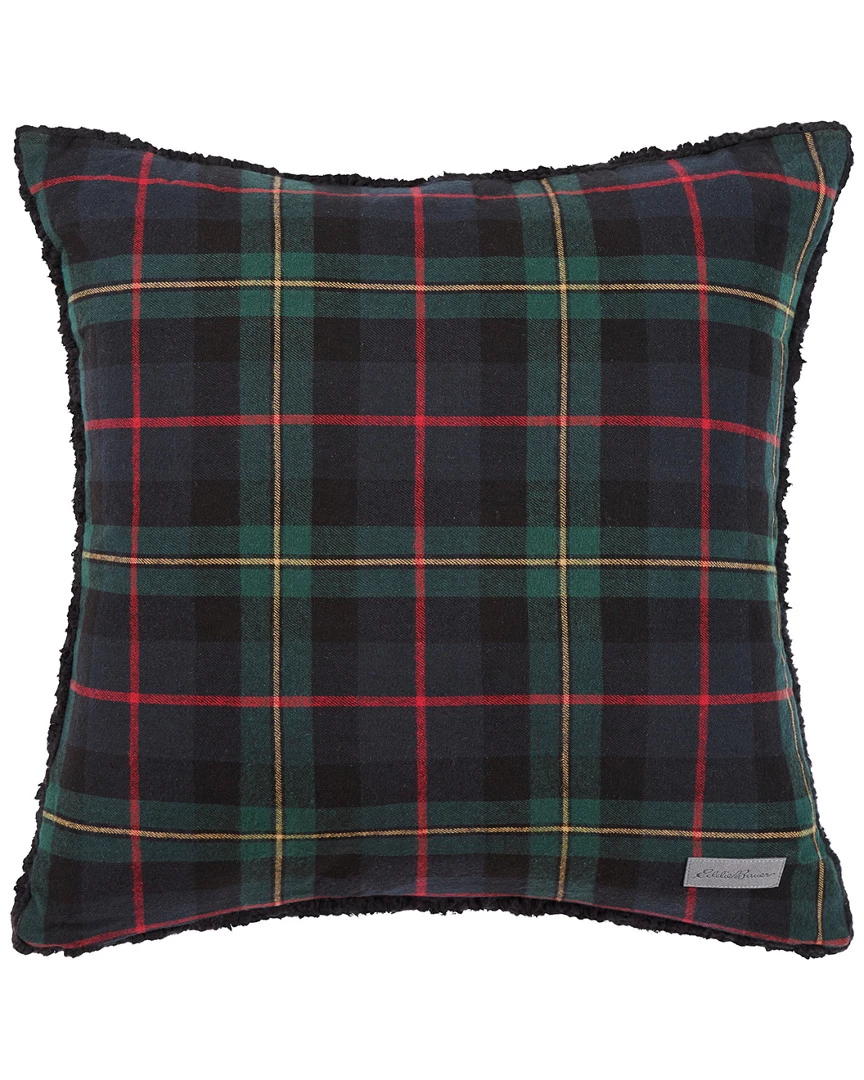- Design details: Bring lodge style to your home with a new decorative throw pillow from Eddie Bauer. Constructed with an all-cotton yarn dye face and a black sherpa reverse, the Mountain Pine Tartan Green Yarn Dye Sherpa Throw Pillow features a rugged plaid print that is perfect for any casual home decor. Pillow is machine washable for easy care and features a zipper closure. Dimensions: 20″L x 20″W.
