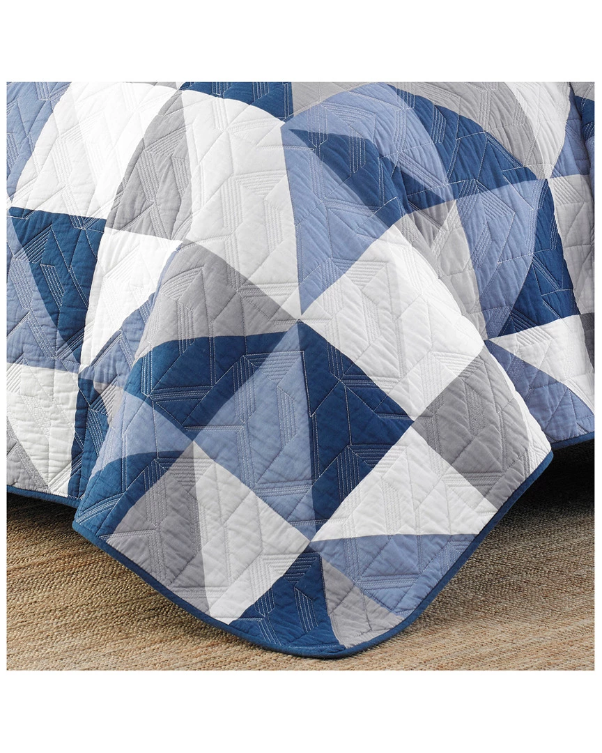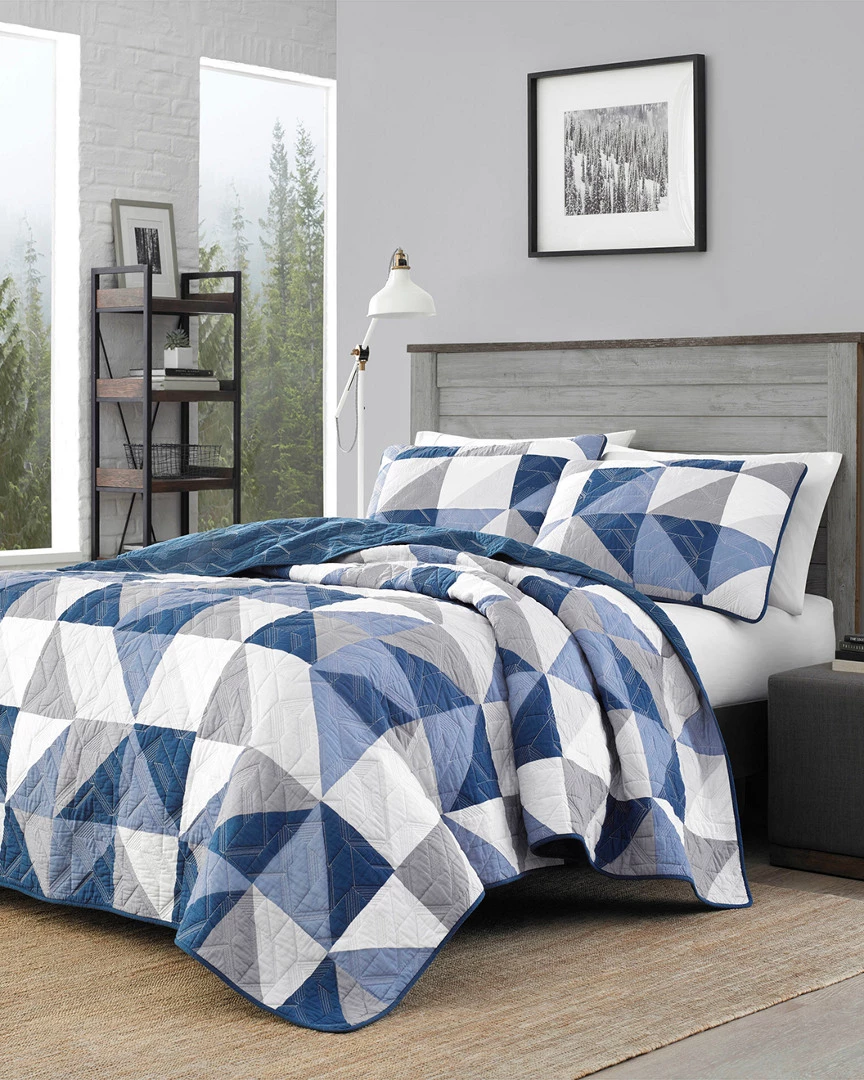 - Design details: Drift off to sleep with the stylish North Cove Quilt Set from Eddie Bauer. This cozy, pre-washed cotton quilt set features a funky geometric printed pattern in shades of navy, blue, grey and white. The geometric theme is mirrored in the quilt stitching and the quilt reverses to a solid navy for a change of pace. Ensemble is machine washable for easy and convenient care. Twin quilt set includes: one quilt (88″L x 68″W) and one sham (21″L x 27″W). Full/Queen quilt set includes: one quilt (90″L x 90″W) and two shams (21″L x 27″W). King quilt set includes: one quilt (96″L x 104″W) and two shams (21″L x 37″W).